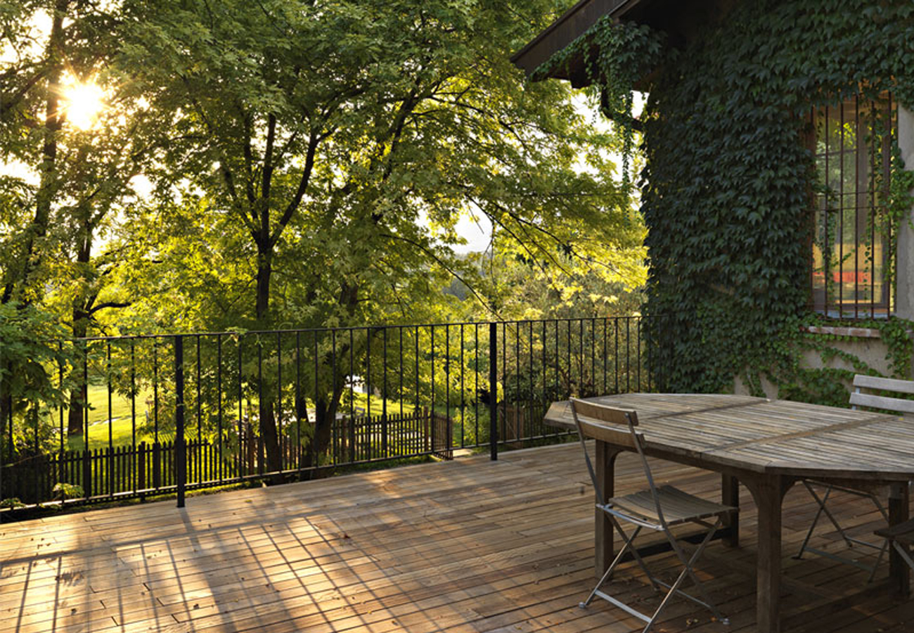 La loggia, ora adibita a soggiorno, è stata uno degli elementi centrali del progetto. Questo spazio è stato mantenuto con i suoi muri in pietra a vista e il tetto in legno, che conferiscono un carattere rustico e accogliente ed è stata integrata con un nuovo volume che ospita la cucina e la zona notte. Un grande terrazzo collega il soggiorno e la cucina, creando una continuità visiva e spaziale tra i due volumi e offrendo una vista panoramica sulle colline circostanti.